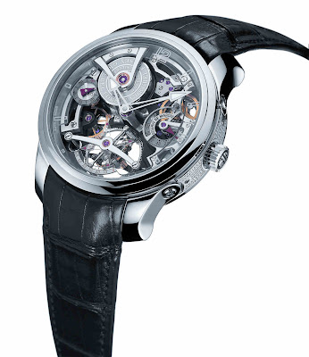 Nicht nur der Fall, sondern auch das Design des Zifferblatts entsprechen dem unverwechselbaren Stil der Ingenieur. Der Unterschied liegt darin, dass der Big Ingenieur das deutlich lesbare Datum um "6.00" anzeigt, während die Gangreserveanzeige für sieben Tage - mit der roten Anzeige für den letzten Tag - ihren Platz bei "3.00" hat. Die Minutenabstufungen sind in fünf Schritten numeriert. Die Größe des Zifferblatts ermöglicht die optimale, großzügig dimensionierte Anzeige aller Indikatoren. Der größte jemals gebaute Ingenieur, in der Tat das Jumbo-Mitglied der Familie, ist auf Robustheit ausgelegt. Dies unterstreicht nicht nur der integrierte Seitenschutz für die Schraubenkrone, sondern auch die Wasserbeständigkeit und Druckfestigkeit bis 12 bar (120 Meter), die dem Design innewohnen.Der Schweizer Luxusuhrenhersteller GREUBEL FORSEY führt die Doppel-Tourbillon-Technik ein, in der ein mechanisches Handaufzugswerk untergebracht ist. Das Kaliber GF 02S ist mit einem Doppel-Tourbillon 30 °, Stunden- und Minutenanzeige, einem Tourbillon 4-Minuten- , Gangreserveanzeige. Technische Details: Uhrwerk: Mechanisches Handaufzugswerk, Kaliber GF 02s Werkmaß : Durchmesser: 38,40 mm: Dicke: 12,15 mm Anzahl der Teile • Kompletter Satz: 385 Teile • 2 Tourbillonkäfige: 128 Teile • Gewicht der beiden Käfige: g Anzahl der Juwelen • 43 • Olivengewölbte Juwelen in Goldchatons Barrels